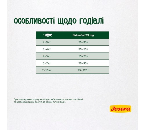 Проблеми з травленням часто зустрічаються у котів, особливо тих, що проживають в домашніх умовах. Сухий корм Josera NatureCat - це беззерновий корм, основними інгредієнтами якого є м'ясо свійської птиці, лосось, овочі, екстракти трав і фрукти. Інгредієнти корму дозволять позбутися від грудок шерсті в шлунку тварини і регулюють рівень рН сечі.