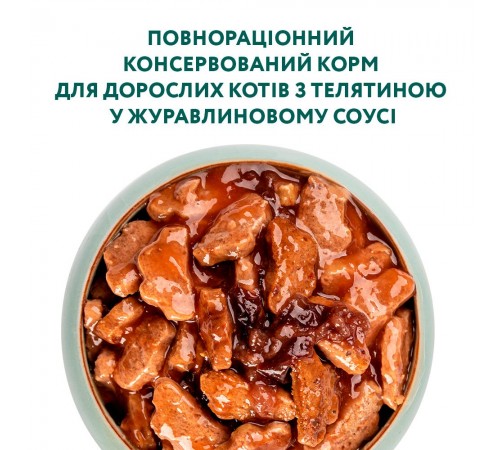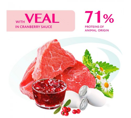 80 % м’яса та продуктів тваринного походження в шматочках (зокрема 21 % з курки, 17 % яловиче серце, 8 % з кролика та інші), злаки, екстракти рослинних білків, мінерали, олії та жири (олія з лосося, олія з огірочника), продукти рослинного походження (зокрема журавлина 0,05 %, чорнобривці (джерело лютеїну) 0,01 %, корінь лопуха, корінь алтея, квітиромашки 0,01 %, кропива 0,01 %, чебрець 0,01 %), Actigen ™ (джерело пребіотик- мананоолігосахариди) 0,01 %, бета-1,3/1,6-глюкани 0,01 %.
