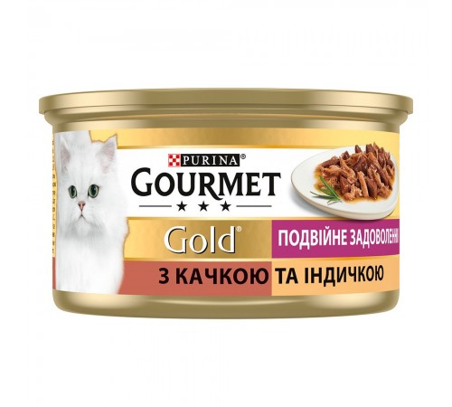 Всі рецепти GOURMET Gold не містять доданих штучних ароматизаторів. Ваш кіт цінує розмаїття в стравах, а Ви завжди у пошуку рецептів, які задовольнять його вишуканий смак. Саме тому, GOURMET Gold створив "Подвійне задоволення" - рецепт, який здатний щодня приводити у захват найвибагливіших гурманів. Ідеальне поєднання двох неповторних текстур у вишуканому рецепті не залишать Вашого улюбленця байдужим. "Подвійне задоволення" від GOURMET Gold - подвійна насолода для Вашого кота!