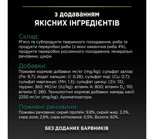 Склад: м'ясо та субпродукти тваринного походження, риба та продукти переробки риби (з яких океанічна риба 4%), продукти переробки рослинного походження, мінеральні речовини, цукри.