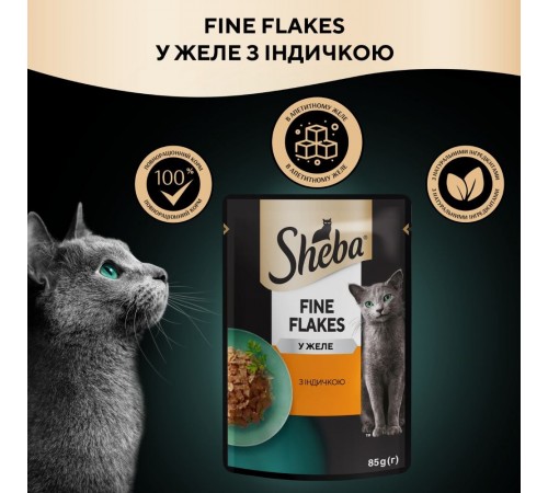 Sheba Fine Flakes – це ніжні шматочки, дбайливо покриті делікатним желе, котре просто тане у роті. Щоденна насолода насиченим смаком індички, яка, сподіваємося, припаде до смаку вашій киці. Всі корми Sheba виготовляються на Європейських фабриках за міжнародними стандартами якості, а рецептури розробляються спільно з нутриціологами і ветеринарами науково-дослідного центру WALTHAM, аби не лише тішити котиків розмаїтими смаками, а й забезпечувати їх необхідними вітамінами і мікроелементами.