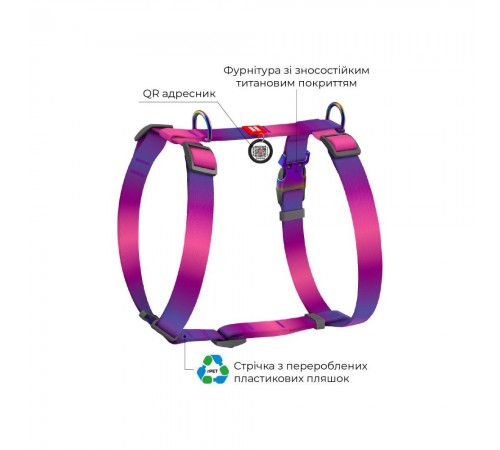 Шлея виконана з екологічно чистого та стійкого R-PET матеріалу, який виготовляється з перероблених пластикових пляшок. Має унікальний градієнтний дизайн, який надасть вашому улюбленцю яскравий і стильний вигляд.