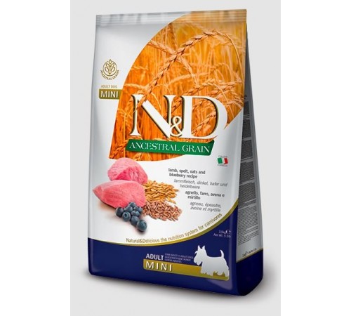 Farmina N&D Ancestral Grain Adult Minin Lamb and Blueberry для дорослих собак маленьких порід, багатий тваринним білком, фруктами, овочами, мінералами і невеликою кількістю спадкових злаків. З крокетами Farmina N&D Ancestral Grain Adult Mini Lamb and Blueberry ви запропонуєте своїй собаці корисний і смачний сухий корм. Його склад був створений у співпраці з факультетом харчування тварин Неаполітанського університету і заснований на моделі природи, а також орієнтований на особливі потреби в харчуванні дорослих собак дрібних порід.