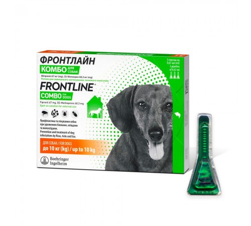 Фронтлайн Комбо (Frontline Combo) - лікарський інсектоакарицидний препарат в формі розчину для зовнішнього застосування.Містить в якості діючих речовин: фіпроніл - 9,8% та S-метопрен - 8,8%, в якості допоміжних речовин - поливидон та полісорбат.Фронтлайн Комбо представляє собою безбарвну прозору рідину, зі слабким специфічним запахом.Випускають препарат розфасованим по 0,67; 1,34; 2,68 та 4,02 мл в поліетиленові піпетки, на яких вказано назву організації-виробника, назву і кількість лікарського засобу, номер серії, дата виготовлення.
