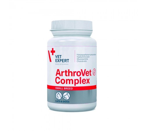 Vet Expert ArthroVet Complex Small breed&cats (Вет Експерт Артровет Комплекс для котів і собак малих порід) – харчова добавка для котів і собак малих порід із порушеннями функції хрящів і суглобів. Підходить для молодих, дорослих і зрілого віку тварин, особливо при ортопедичних травмах, перед ортопедичними процедурами та у період одужання. Склад: глюкозамін - 169 мг, гарпагофітум - 33 мг, сушене авокадо - 33 мг, екстракт сої - 33 мг, хондроїтин - 22 мг, вітамін С - 25 мг, цинк - 1,25 мг, марганець 6,15 мг, гіалуронова кислота - 5,5 мг.Показання: